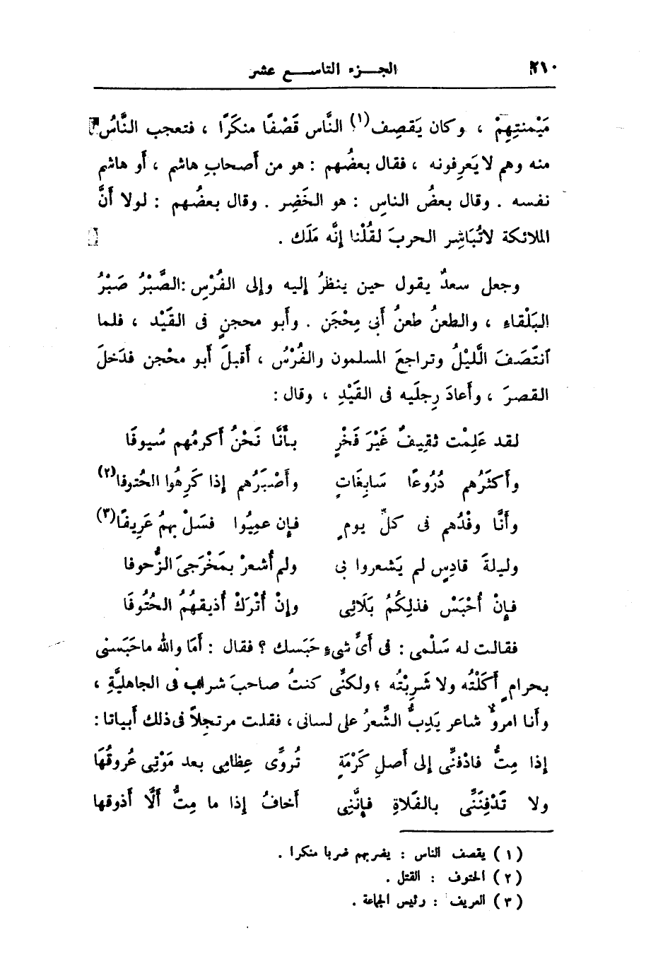 وجعل سعد يقول حين ينظر إليه وإلى الفرس: الصّبر صبر البلقاء، والطعن طعن أبى محجن. وأبو محجن فى القيد، فلما انتصف الّليل وتراجع المسلمون والفرس، أقبل أبو محجن فدخل القصر، وأعاد رجليه فى القيد، وقال: