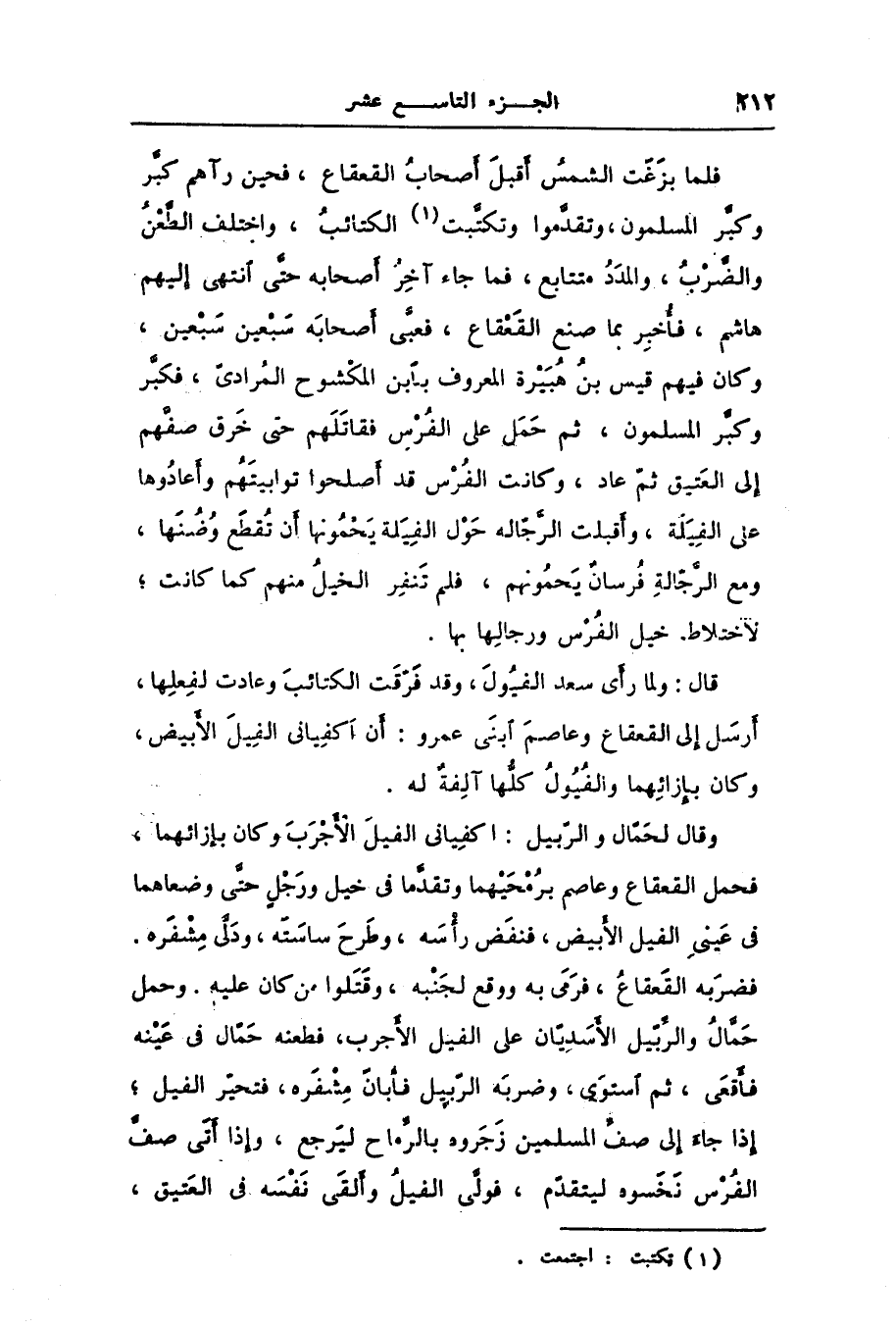 فلما بزغت الشمس أقبل أصحاب القعقاع، فحين رآهم كبّر وكبّر المسلمون، وتقدّموا وتكتّبت [1] الكتائب، واختلف الطّعن والضّرب، والمدد متتابع، فما جاء آخر أصحابه حتّى انتهى إليهم هاشم، فأخبر بما صنع القعقاع، فعبّى أصحابه سبعين سبعين، وكان فيهم قيس بن هبيرة المعروف بابن المكشوح المرادىّ، فكبّر وكبّر المسلمون، ثم حمل على الفرس فقاتلهم حتى خرق صفّهم إلى العتيق ثمّ عاد، وكانت الفرس قد أصلحوا توابيتهم وأعادوها على الفيلة، وأقبلت الرّجّاله حول الفيلة يحمونها أن تقطع وضنها، ومع الرّجّالة فرسان يحمونهم، فلم تنفر الخيل منهم كما كانت؛ لاختلاط خيل الفرس ورجالها بها.