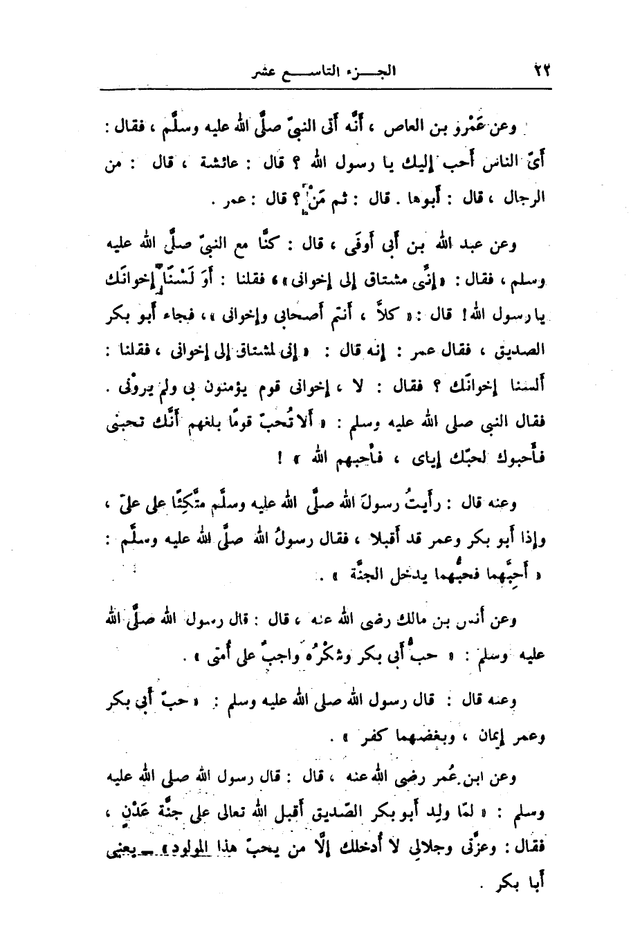 وعن عمرو بن العاص، أنّه أتى النبىّ صلّى الله عليه وسلّم، فقال: أىّ الناس أحب إليك يا رسول الله؟ قال: عائشة، قال: من الرجال، قال: أبوها. قال: ثم من؟ قال: عمر
