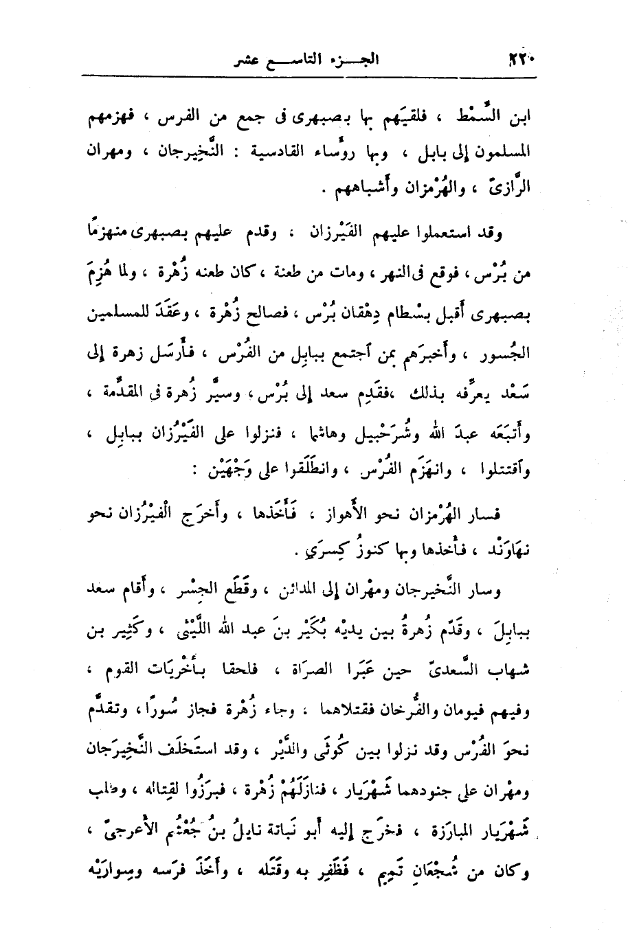 وقد استعملوا عليهم الفيرزان، وقدم عليهم بصبهرى منهزما من برس، فوقع فى النهر، ومات من طعنة، كان طعنه زهرة، ولما هزم بصبهرى أقبل بسطام دهقان برس، فصالح زهرة، وعقد للمسلمين الجسور، وأخبرهم بمن اجتمع ببابل من الفرس، فأرسل زهرة إلى سعد يعرّفه بذلك، فقدم سعد إلى برس، وسيّر زهرة فى المقدّمة، وأتبعه عبد الله وشرحبيل وهاشما، فنزلوا على الفيرزان ببابل، واقتتلوا، وانهزم الفرس، وانطلقوا على وجهين: