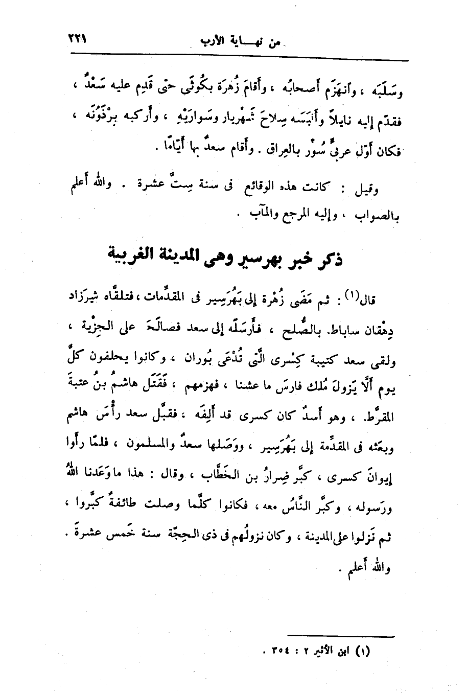قال [1] : ثم مضى زهرة إلى بهرسير فى المقدّمات، فتلقّاه شيرزاد دهقان ساباط بالصّلح، فأرسله إلى سعد فصالحه على الجزية، ولقى سعد كتيبة كسرى الّتى تدعى بوران، وكانوا يحلفون كلّ يوم ألّا يزول ملك فارس ما عشنا، فهزمهم، فقتل هاشم بن عتبة المقرّط، وهو أسد كان كسرى قد ألفه، فقبّل سعد رأس هاشم وبعثه فى المقدّمة إلى بهرسير، ووصلها سعد والمسلمون، فلمّا رأوا إيوان كسرى، كبّر ضرار بن الخطّاب، وقال: هذا ما وعدنا الله ورسوله، وكبّر النّاس معه، فكانوا كلّما وصلت طائفة كبّروا، ثم نزلوا على المدينة، وكان نزولهم فى ذى الحجّة سنة خمس عشرة.
