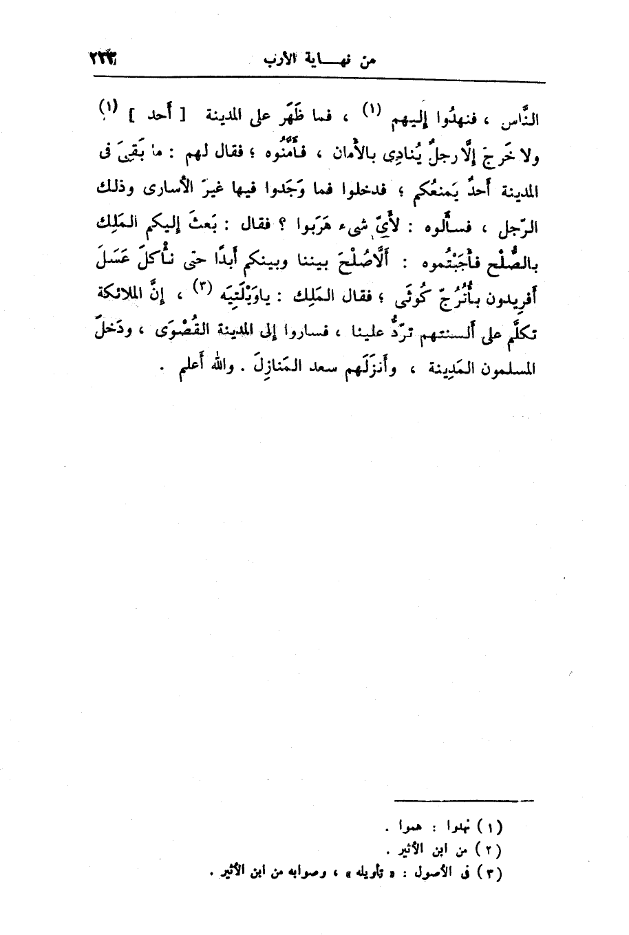 النّاس، فنهدوا إليهم [1] ، فما ظهر على المدينة [أحد] [1] ولا خرج إلّا رجل ينادى بالأمان، فأمّنوه؛ فقال لهم: ما بقى فى المدينة أحد يمنعكم؛ فدخلوا فما وجدوا فيها غير الأسارى وذلك الرّجل، فسألوه: لأىّ شىء هربوا؟ فقال: بعث إليكم الملك بالصّلح فأجبتموه: ألّا صلح بيننا وبينكم أبدا حتى نأكل عسل أفريدون بأترجّ كوثى؛ فقال الملك: يا ويلتيه [3] ، إنّ الملائكة تكلّم على ألسنتهم ترّدّ علينا، فساروا إلى المدينة القصوى، ودخل المسلمون المدينة، وأنزلهم سعد المنازل. والله أعلم.