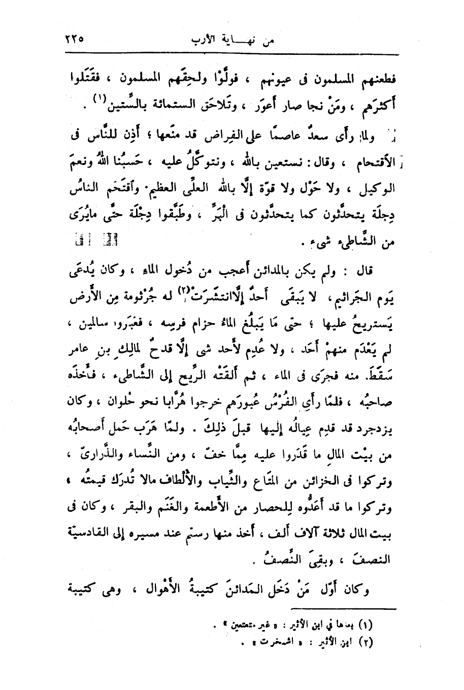 ولما رأى سعد عاصما على الفراض قد منعها؛ أذن للنّاس فى الأقتحام، وقال: نستعين بالله، ونتوكّل عليه، حسبنا الله ونعم الوكيل، ولا حول ولا قوّة إلّا بالله العلّى العظيم. واقتحم الناس دجلة يتحدّثون كما يتحدّثون فى البرّ، وطبّقوا دجلة حتّى ما يرى من الشّاطىء شىء.