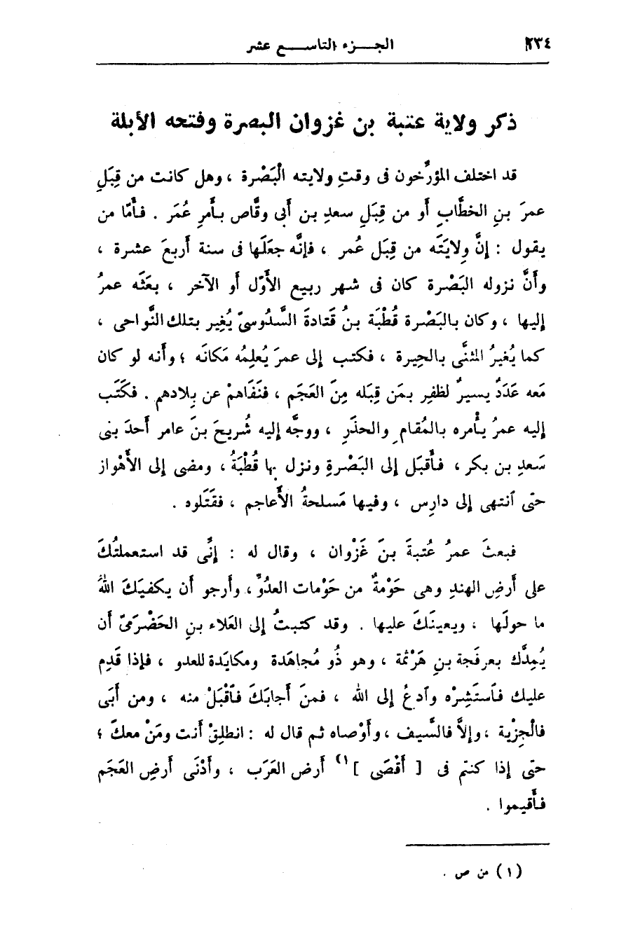 فبعث عمر عتبة بن غزوان، وقال له: إنّى قد استعملتك على أرض الهند وهى حومة من حومات العدوّ، وأرجو أن يكفيك الله ما حولها، ويعينك عليها. وقد كتبت إلى العلاء بن الحضرمىّ أن يمدّك بعرفجة بن هرثمة، وهو ذو مجاهدة ومكايدة للعدو، فإذا قدم عليك فاستشره وادع إلى الله، فمن أجابك فاقبل منه، ومن أبى فالجزية، وإلّا فالسّيف، وأوصاه ثم قال له: انطلق أنت ومن معك؛ حتى إذا كنتم فى [أقصى] [1] أرض العرب، وأدنى أرض العجم فأقيموا.