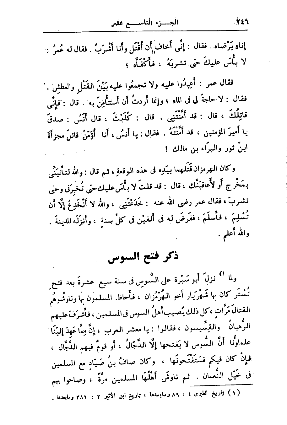فقال: لا حاجة لى فى الماء؛ وإنما أردت أن أستأمن به. قال: فإنّى قاتلك، قال: قد أمّنتنى. قال: كذبت، قال أنس: صدق يا أمير المؤمنين، قد أمّنته. فقال: يا أنس، أنا أؤمّن قاتل مجزأة ابن ثور والبراء بن مالك! وكان الهرمزان قتلهما بيده فى هذه الوقعة، ثم قال: والله لتأتينّى بمخرج أو لأعاقبنّك، قال: قد قلت لا بأس عليك حتى تخبرنى وحتى تشرب، فقال عمر رضى الله عنه: خدعتنى، والله لا أنخدع إلّا أن تسلم، فأسلم، ففرض له فى ألفين فى كلّ سنة، وأنزله المدينة.