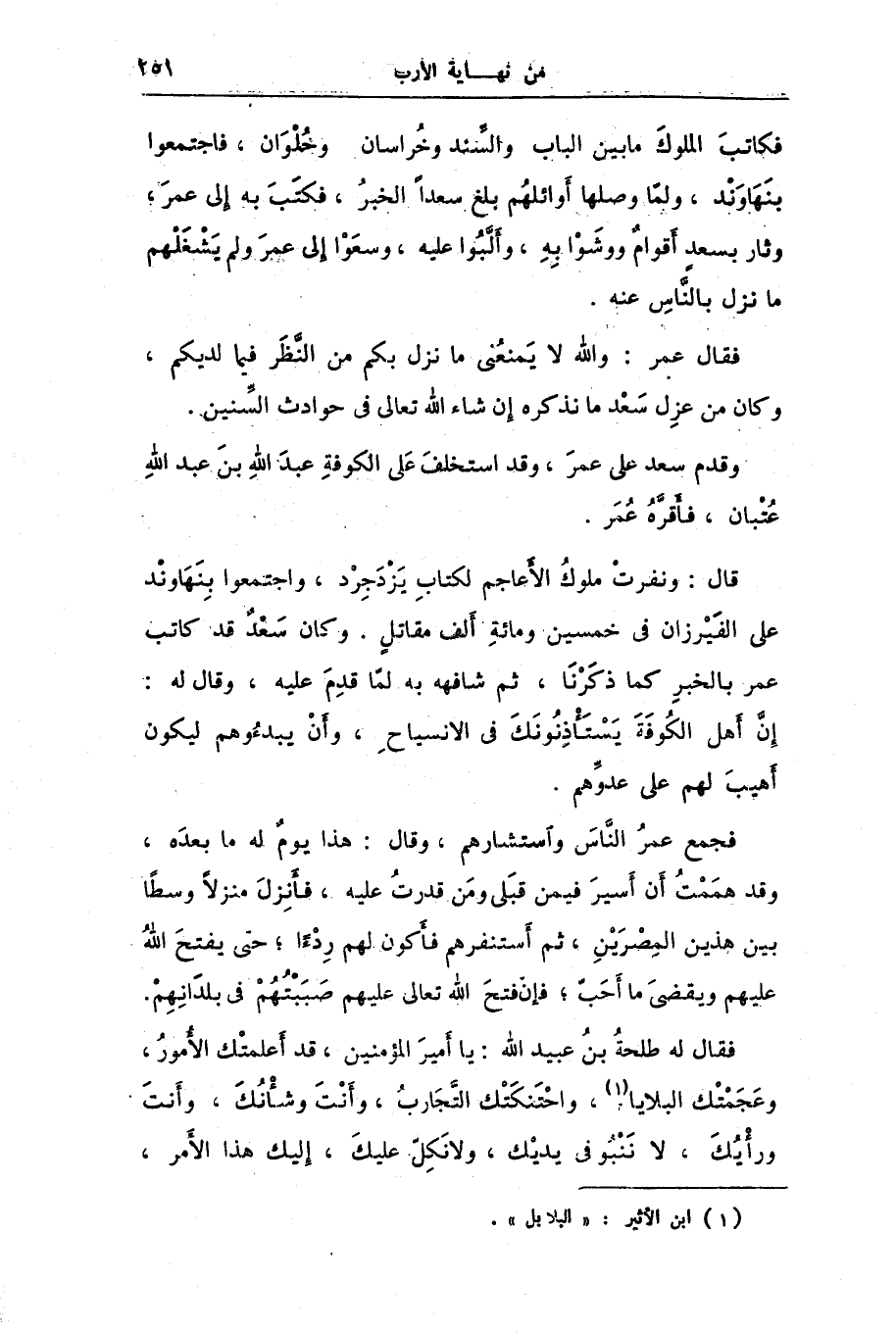 قال: ونفرت ملوك الأعاجم لكتاب يزدجرد، واجتمعوا بنهاوند على الفيرزان فى خمسين ومائة ألف مقاتل. وكان سعد قد كاتب عمر بالخبر كما ذكرنا، ثم شافهه به لمّا قدم عليه، وقال له: