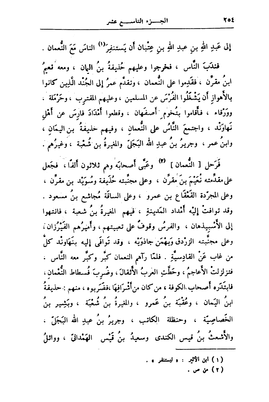 فرحل [النّعمان] [2] وعبّى أصحابه وهم ثلاثون ألفا، فجعل على مقدّمته نعيم بن مقرّن، وعلى مجنّبته حذيفة وسويد بن مقرّن، وعلى المجرّدة القعقاع بن عمرو، وعلى الساقة مجاشع بن مسعود.