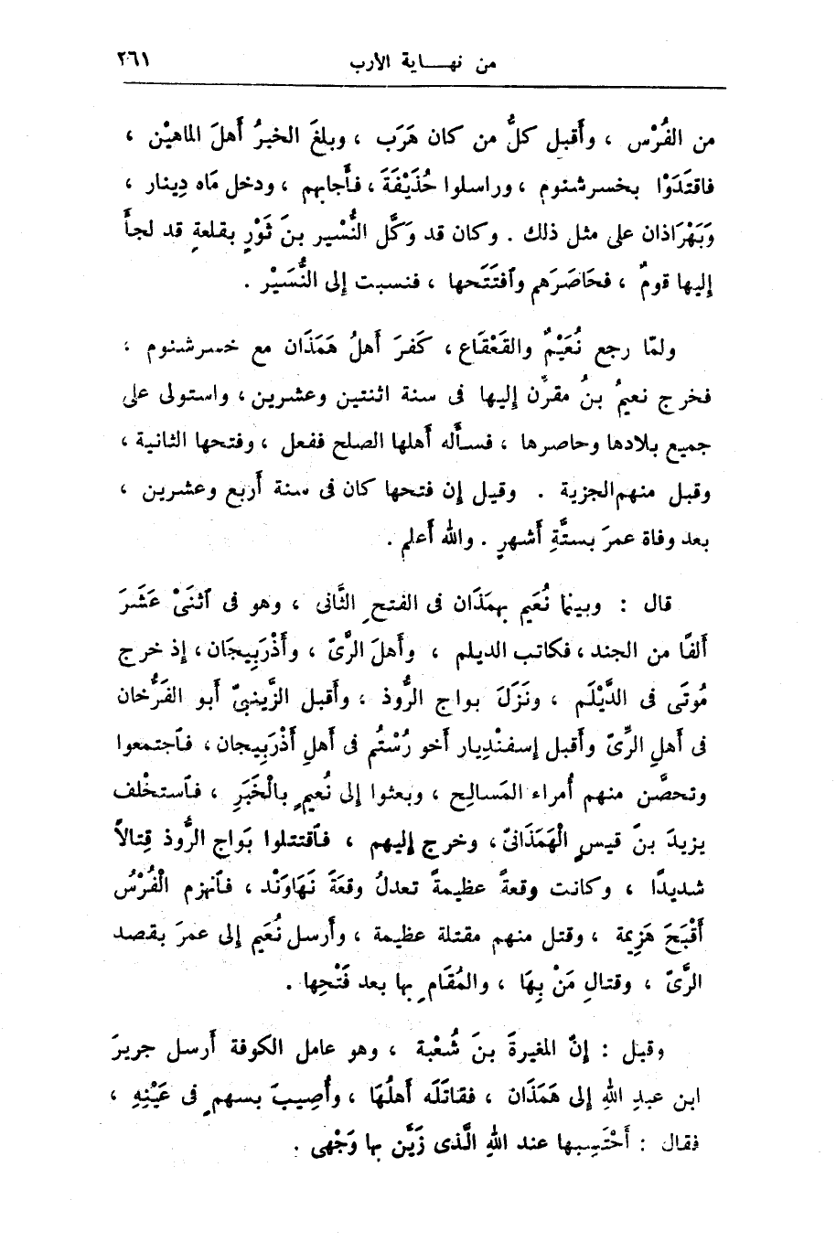 ولمّا رجع نعيم والقعقاع، كفر أهل همذان مع خسرشنوم، فخرج نعيم بن مقرّن إليها فى سنة اثنتين وعشرين، واستولى على جميع بلادها وحاصرها، فسأله أهلها الصلح ففعل، وفتحها الثانية، وقبل منهم الجزية. وقيل إن فتحها كان فى سنة أربع وعشرين، بعد وفاة عمر بستّة أشهر. والله أعلم.