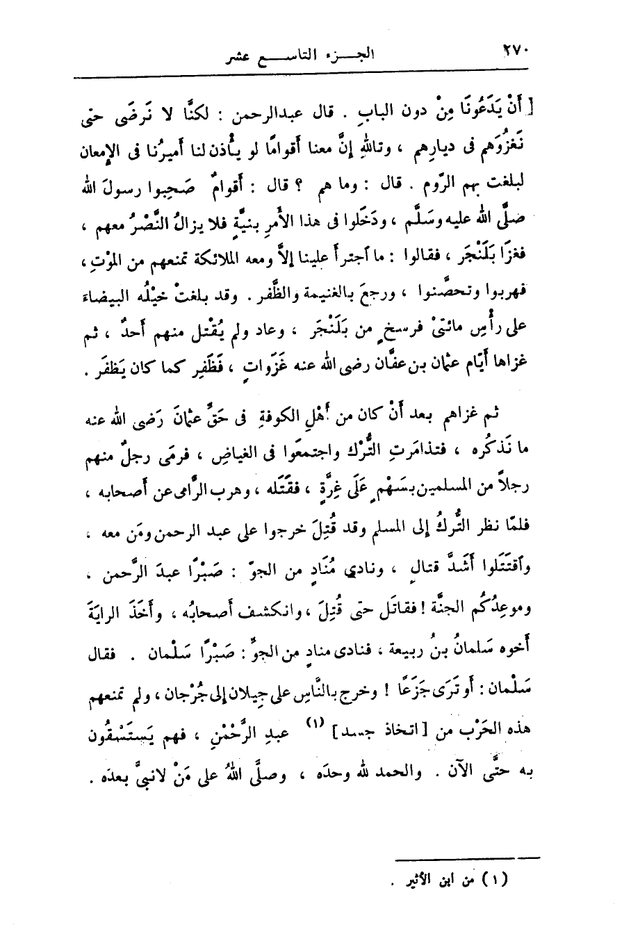 ثم غزاهم بعد أن كان من أهل الكوفة فى حقّ عثمان رضى الله عنه ما نذكره، فتذامرت التّرك واجتمعوا فى الغياض، فرمى رجل منهم رجلا من المسلمين بسهم على غرّة، فقتله، وهرب الرّامى عن أصحابه، فلمّا نظر التّرك إلى المسلم وقد قتل خرجوا على عبد الرحمن ومن معه، واقتتلوا أشدّ قتال، ونادى مناد من الجوّ: صبرا عبد الرّحمن، وموعدكم الجنّة! فقاتل حتى قتل، وانكشف أصحابه، وأخذ الراية أخوه سلمان بن ربيعة، فنادى مناد من الجوّ: صبرا سلمان. فقال سلمان: أو ترى جزعا! وخرج بالنّاس على جيلان إلى جرجان، ولم تمنعهم هذه الحرب من [اتخاذ جسد] [1] عبد الرّحمن، فهم يستسقون به حتّى الآن. والحمد لله وحده، وصلّى الله على من لا نبىّ بعده.