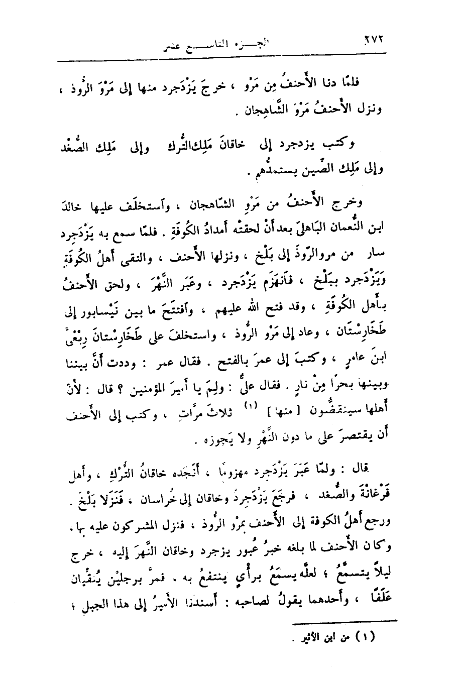 وخرج الأحنف من مرو الشّاهجان، واستخلف عليها خالد ابن النّعمان الباهلىّ بعد أن لحقته أمداد الكوفة. فلمّا سمع به يزدجرد سار من مرو الرّوذ إلى بلخ، ونزلها الأحنف، والتقى أهل الكوفة ويزدجرد ببلخ، فانهزم يزدجرد، وعبر النّهر، ولحق الأحنف بأهل الكوفة، وقد فتح الله عليهم، وافتتح ما بين نيسابور إلى طخارستان، وعاد إلى مرو الرّوذ، واستخلف على طخارستان ربعىّ ابن عامر، وكتب إلى عمر بالفتح. فقال عمر: وددت أنّ بيننا وبينها بحرا من نار. فقال علىّ: ولم يا أمير المؤمنين؟ قال: لأنّ أهلها سينقضّون [منها] [1] ثلاث مرّات، وكتب إلى الأحنف أن يقتصر على ما دون النّهر ولا يجوزه.