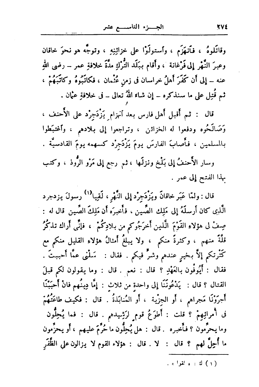 قال: ثم أقبل أهل فارس بعد انهزام يزدجرد على الأحنف، وصالحوه ودفعوا له الخزائن، وتراجعوا إلى بلادهم، واغتبطوا بالمسلمين، فأصاب الفارس يوم يزدجرد كسهمه يوم القادسيّة.