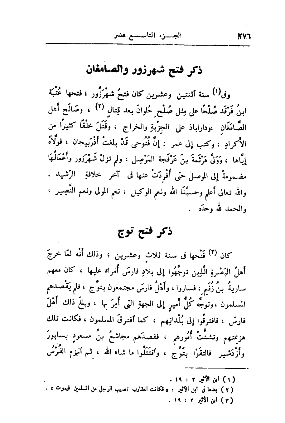 وفى [1] سنة اثنتين وعشرين كان فتح شهرزور؛ فتحها عتبة ابن فرقد صلحا على مثل صلح حلوان بعد قتال [2] ، وصالح أهل الصّامغان، وداراباذ على الجزية والخراج، وقتل خلقا كثيرا من الأكراد، وكتب إلى عمر: إنّ فتوحى قد بلغت أذربيجان، فولّاه إيّاها، وولىّ هرثمة بن عرفجة الموصل، ولم تزل شهرزور وأعمالها مضمومة إلى الموصل حتى أفردت عنها فى آخر خلافة الرّشيد.