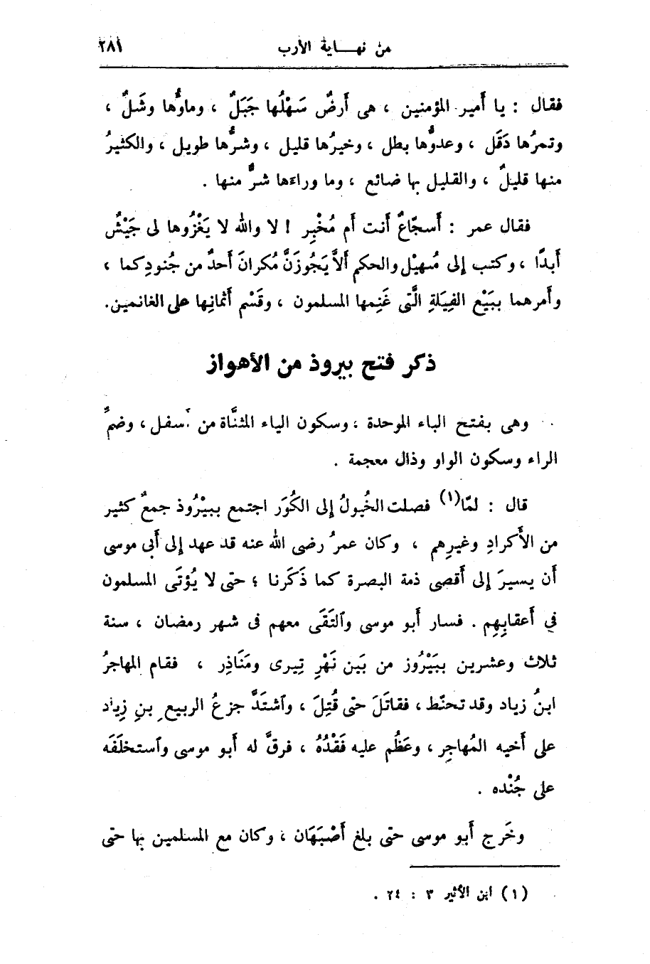 قال: لمّا [1] فصلت الخيول إلى الكور اجتمع ببيروذ جمع كثير من الأكراد وغيرهم، وكان عمر رضى الله عنه قد عهد إلى أبى موسى أن يسير إلى أقصى ذمة البصرة كما ذكرنا؛ حتى لا يؤتى المسلمون فى أعقابهم. فسار أبو موسى والتقى معهم فى شهر رمضان، سنة ثلاث وعشرين ببيروز من بين نهر تيرى ومناذر، فقام المهاجر ابن زياد وقد تحنّط، فقاتل حتى قتل، واشتدّ جزع الربيع بن زياد على أخيه المهاجر، وعظم عليه فقده، فرقّ له أبو موسى واستخلفه على جنده.