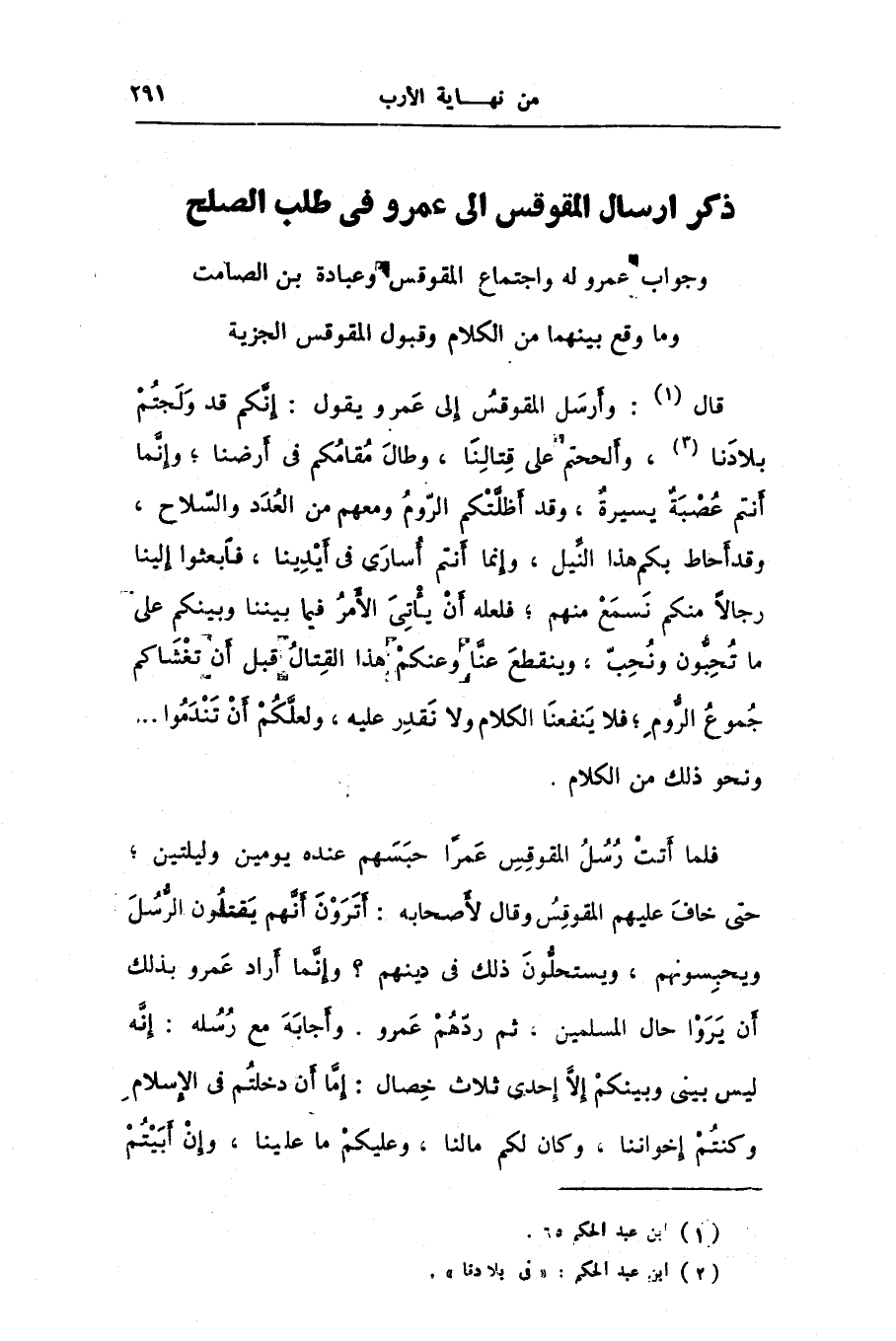 وما وقع بينهما من الكلام وقبول المقوقس الجزية قال [1] : وأرسل المقوقس إلى عمرو يقول: إنّكم قد ولجتم بلادنا [2] ، وألححتم على قتالنا، وطال مقامكم فى أرضنا؛ وإنّما أنتم عصبة يسيرة، وقد أظلّتكم الرّوم ومعهم من العدد والسّلاح، وقد أحاط بكم هذا النّيل، وإنما أنتم أسارى فى أيدينا، فابعثوا إلينا رجالا منكم نسمع منهم؛ فلعله أن يأتى الأمر فيما بيننا وبينكم على ما تحبّون ونحبّ، وينقطع عنّا وعنكم هذا القتال قبل أن تغشاكم جموع الرّوم؛ فلا ينفعنا الكلام ولا نقدر عليه، ولعلّكم أن تندموا ...