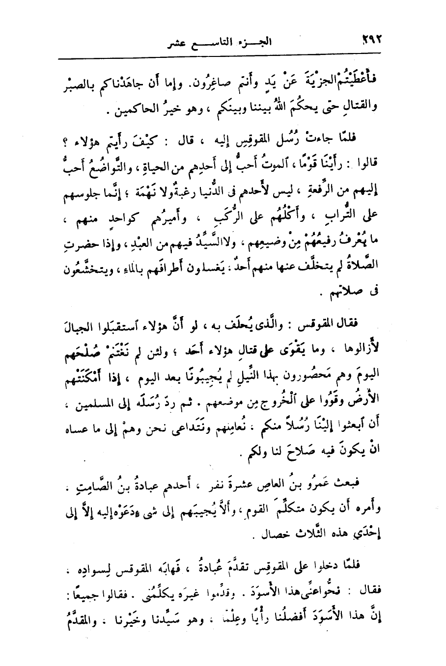 فبعث عمرو بن العاص عشرة نفر، أحدهم عبادة بن الصّامت، وأمره أن يكون متكلّم القوم، وألّا يجيبهم إلى شىء دعوه إليه إلّا إلى إحدى هذه الثّلاث خصال.