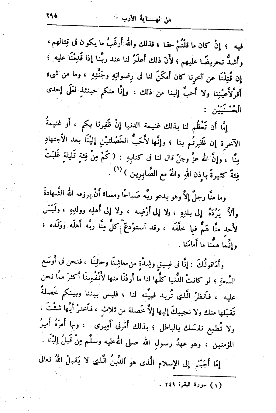 إمّا أن تعظم لنا بذلك غنيمة الدنيا إن ظفرنا بكم، أو غنيمة الآخرة إن ظفرتم بنا؛ وإنّها لأحبّ الخصلتين إلينا بعد الاجتهاد منّا، وإنّ الله عزّ وجلّ قال لنا فى كتابه: كَمْ مِنْ فِئَةٍ قَلِيلَةٍ غَلَبَتْ فِئَةً كَثِيرَةً بِإِذْنِ اللَّهِ وَاللَّهُ مَعَ الصَّابِرِينَ