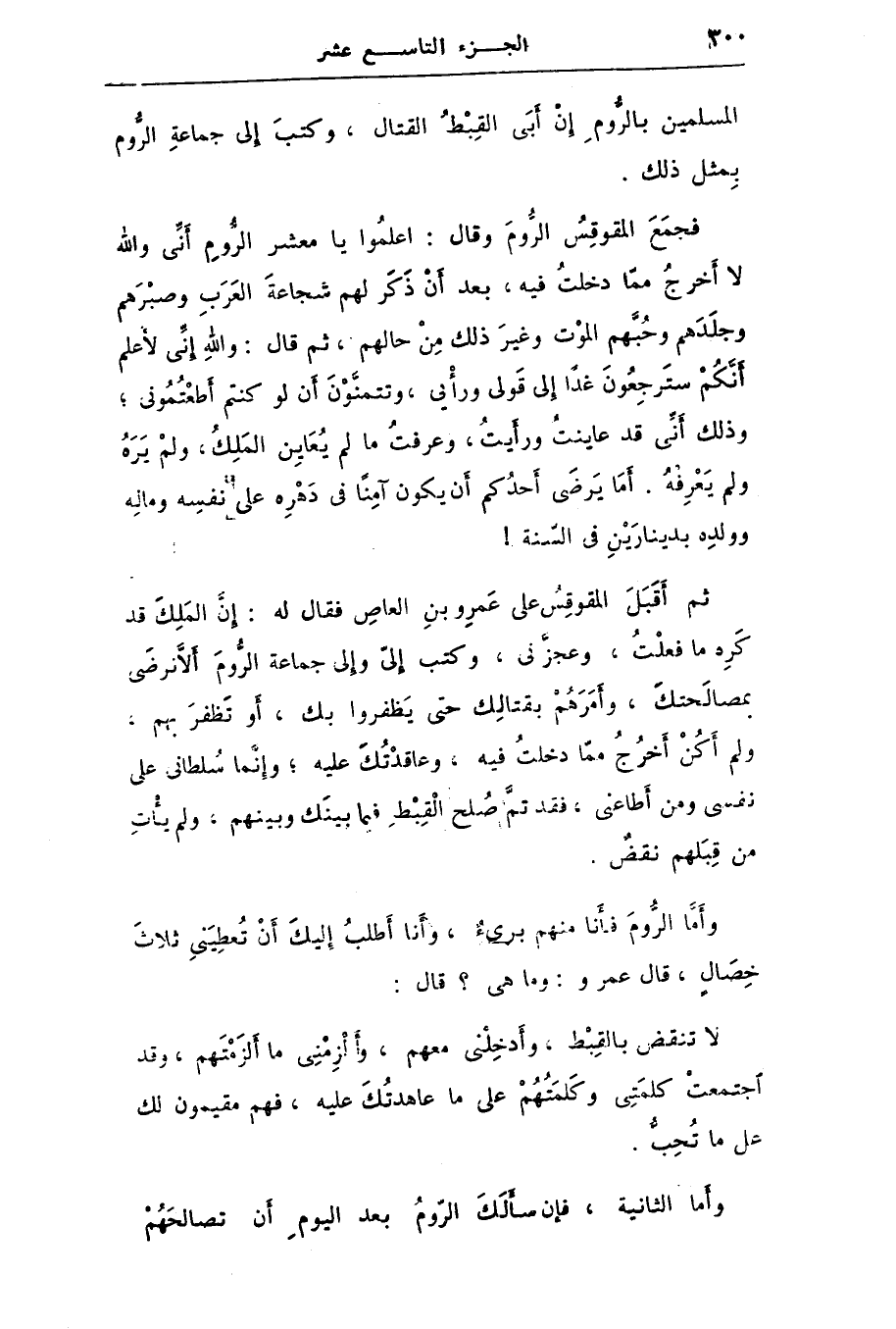 وأمّا الرّوم فأنا منهم برىء، وأنا أطلب إليك أن تعطينى ثلاث خصال، قال عمرو: وما هى؟ قال:
