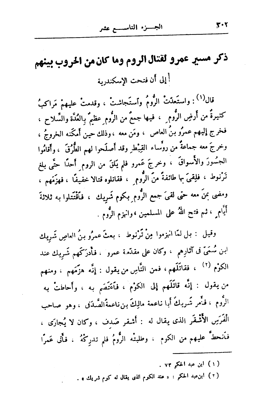 قال [1] : واستعدّت الرّوم واستجاشت، وقدمت عليهم مراكب كثيرة من أرض الرّوم، فيها جمع من الرّوم عظيم بالعدّة والسّلاح، فخرج إليهم عمرو بن العاص، ومن معه، وذلك حين أمكنه الخروج، وخرج معه جماعة من رؤساء القبط وقد أصلحوا لهم الطّرق، وأقاموا الجسور والأسواق، وخرج عمرو فلم يلق من الروم أحدا حتّى بلغ ترنوط، فلقى بها طائفة من الرّوم، فقاتلوه قتالا خفيفا، فهزمهم، ومضى بمن معه حتى لقى جمع الرّوم بكوم شريك، فاقتتلوا به ثلاثة أيّام، ثم فتح الله على المسلمين، وانهزم الرّوم.