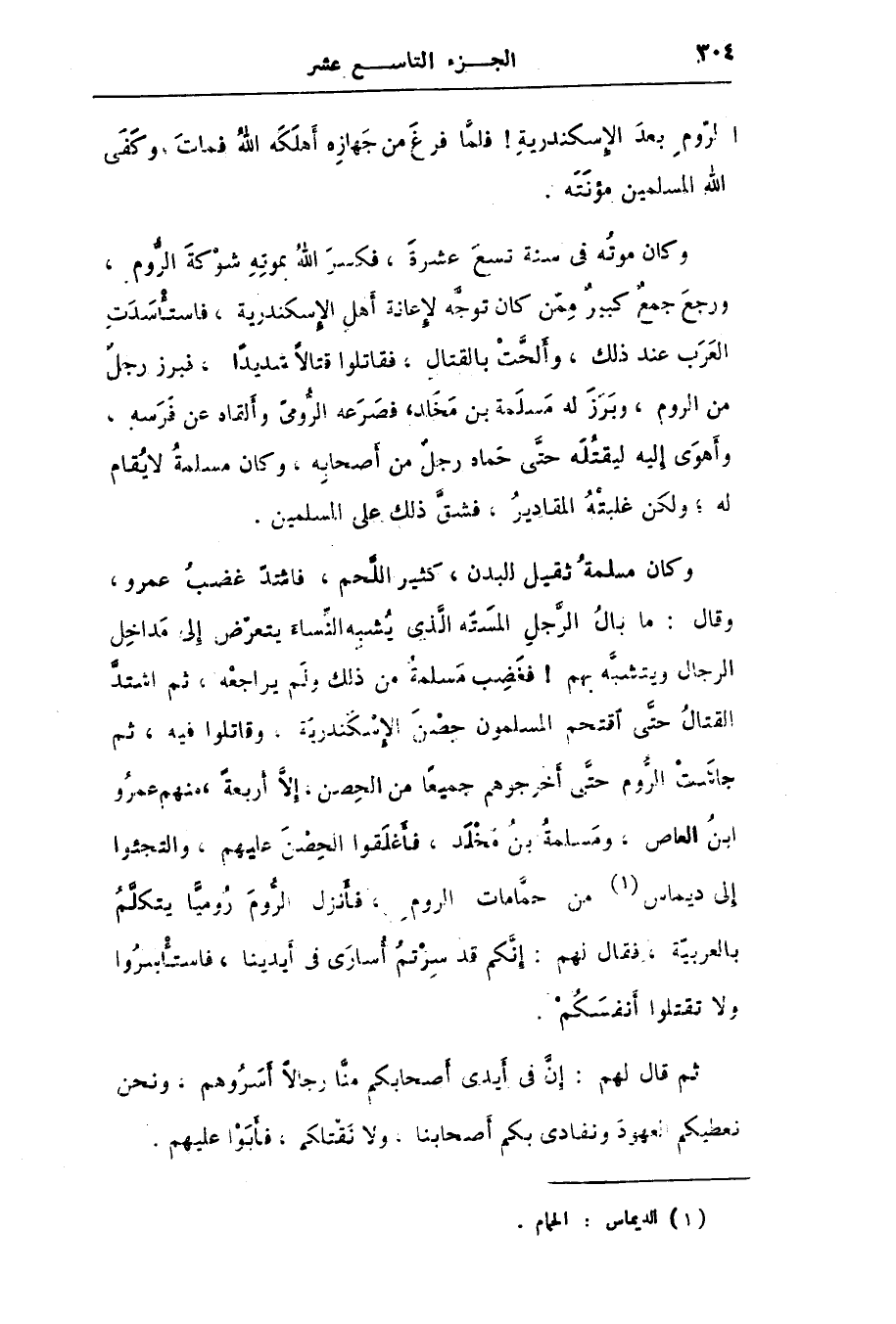 وكان مسلمة ثقيل للبدن، كثير اللّحم، فاشتدّ غضب عمرو، وقال: ما بال الرّجل المستّه الّذى يشبه النّساء يتعرّض إلى مداخل الرجال ويتشبّه بهم! فغضب مسلمة من ذلك ولم يراجعه، ثم اشتدّ القتال حتّى اقتحم المسلمون حصن الإسكندريّة، وقاتلوا فيه، ثم جاشت الرّوم حتّى أخرجوهم جميعا من الحصن، إلّا أربعة، منهم عمرو ابن العاص، ومسلمة بن مخلد، فأغلقوا الحصن عليهم، والتجئوا إلى ديماس [1] من حمّامات الروم، فأنزل الرّوم روميّا يتكلّم بالعربيّة، فقال لهم: إنّكم قد سرتم أسارى فى أيدينا، فاستأسروا ولا تقتلوا أنفسكم.