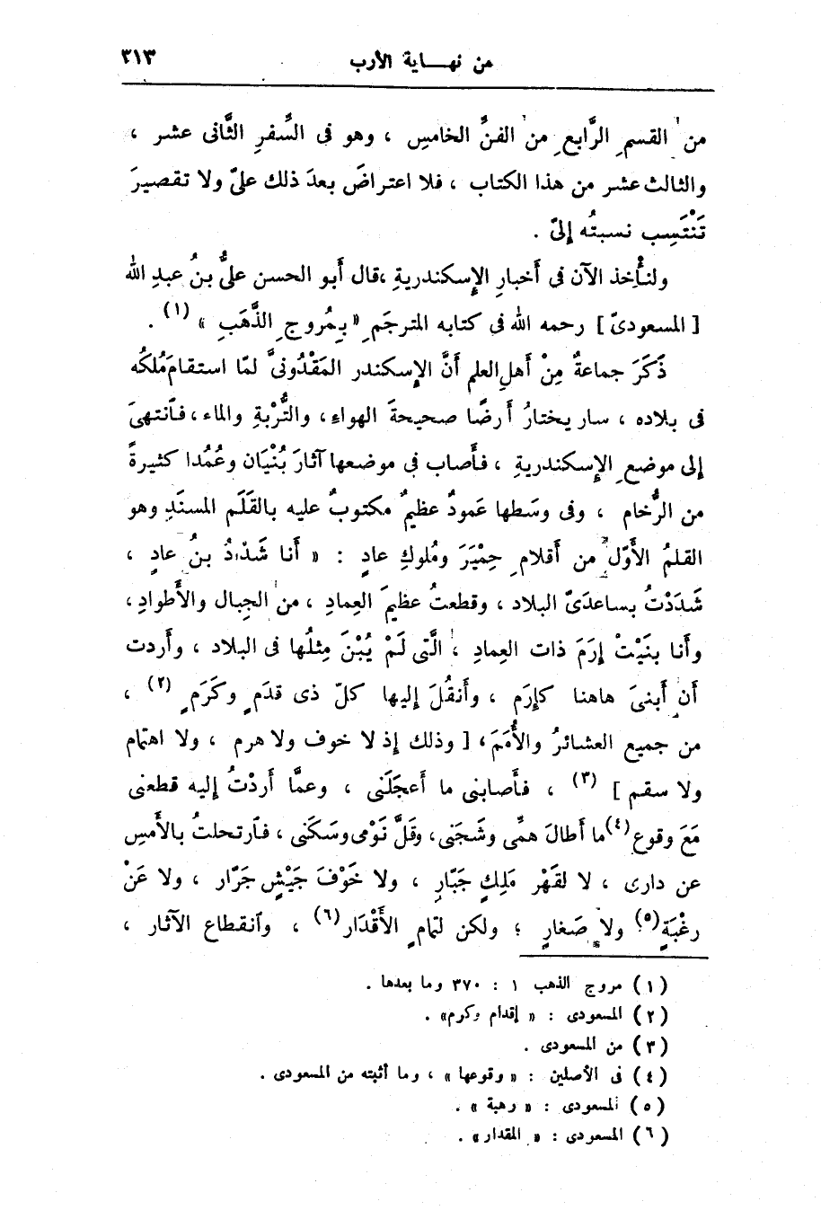 ولنأخذ الآن فى أخبار الإسكندرية، قال أبو الحسن علىّ بن عبد الله [المسعودىّ] رحمه الله فى كتابه المترجم «بمروج الذّهب» [1] .