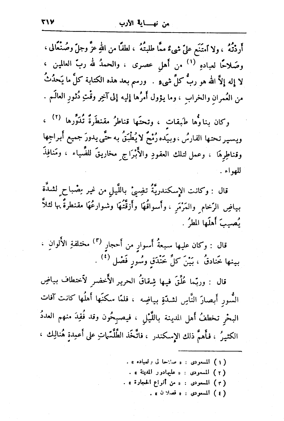 قال: وكانت الإسكندريّة تضيئ باللّيل من غير مصباح لشدّة بياض الرّخام والمرمر، وأسواقها وأزقّتها وشوارعها مقنطرة بها لئلّا يصيب أهلها المطر.