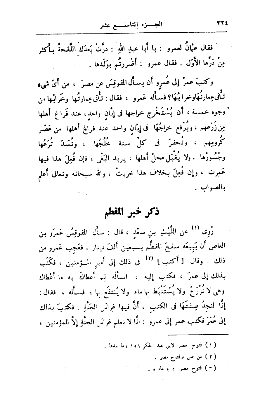 روى [1] عن اللّيث بن سعد، قال: سأل المقوقس عمرو بن العاص أن يبيعه سفح المقطّم بسبعين ألف دينار، فعجب عمرو من ذلك. وقال [أكتب] [2] فى ذلك إلى أمير المؤمنين، فكتب بذلك إلى عمر، فكتب إليه، اسأله لم أعطاك به ما أعطاك وهى لا تزرع ولا يستنبط بها ماء ولا ينتفع بها؛ فسأله، فقال: