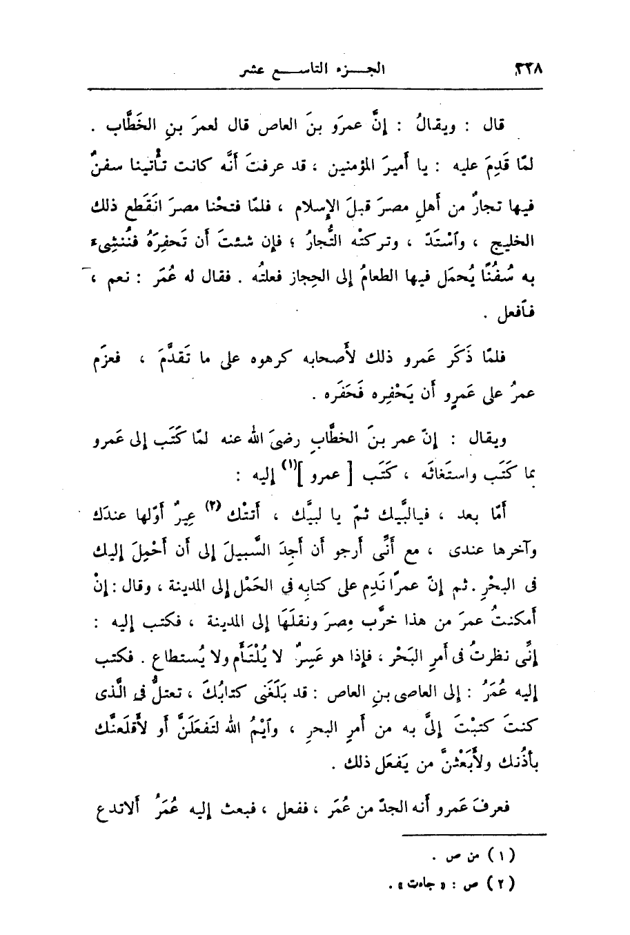 أمّا بعد، فيا لبّيك ثمّ يا لبّيك، أتتك [2] عير أوّلها عندك وآخرها عندى، مع أنّى أرجو أن أجد السّبيل إلى أن أحمل إليك فى البحر. ثم إنّ عمرا ندم على كتابه فى الحمل إلى المدينة، وقال: إن أمكنت عمر من هذا خرّب مصر ونقلها إلى المدينة، فكتب إليه: