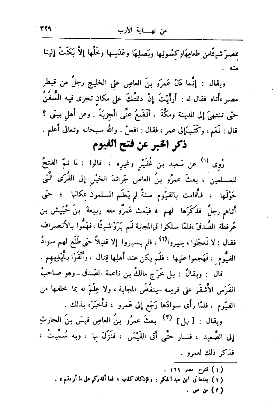 روى [1] عن سعيد بن غفير وغيره، قالوا: لما تمّ الفتح للمسلمين، بعث عمرو بن العاص جرائد الخيل إلى القرى الّتى حولها، فأقامت بالفيّوم سنة لم يعلم المسلمون بمكانها؛ حتى أتاهم رجل فذكرها لهم، فبعث عمرو معه ربيعة بن حبيش بن عرفطة الصّدفىّ، فلمّا سلكوا فى المجابة لم يروا شيئا، فهمّوا بالانصراف فقال: لا تعجلوا، سيروا [2] ، فلم يسيروا إلا قليلا حتى طلع لهم سواد الفيّوم، فهجموا عليها، فلم يكن عند أهلها قتال، وألقوا بأيديهم.