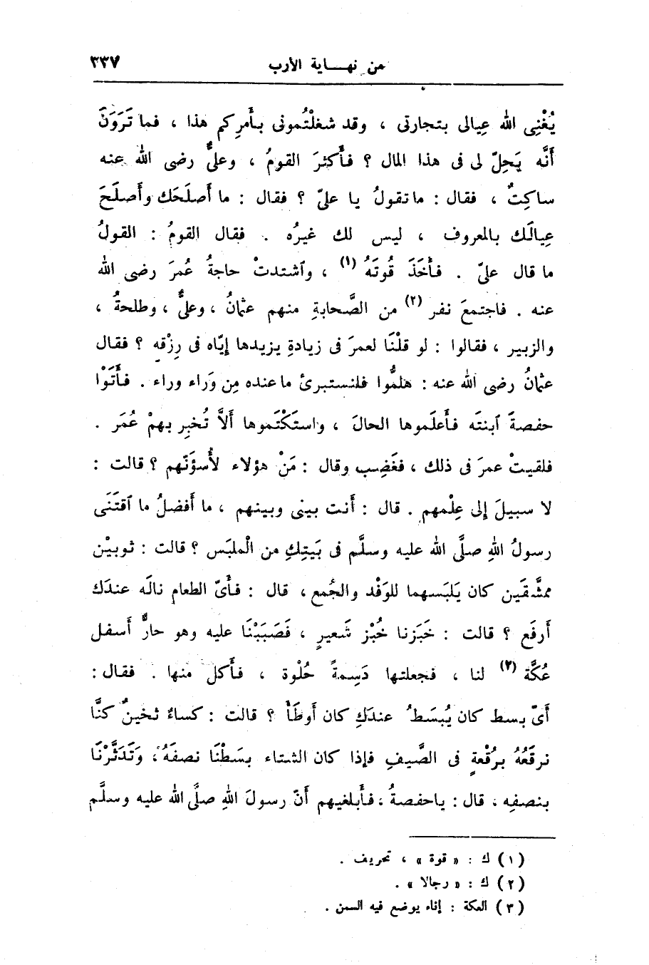 يغنى الله عيالى بتجارتى، وقد شغلتمونى بأمركم هذا، فما ترون أنّه يحلّ لى فى هذا المال؟ فأكثر القوم، وعلىّ رضى الله عنه ساكت، فقال: ما تقول يا علىّ؟ فقال: ما أصلحك وأصلح عيالك بالمعروف، ليس لك غيره. فقال القوم: القول ما قال علىّ. فأخذ قوته [1] ، واشتدت حاجة عمر رضى الله عنه. فاجتمع نفر [2] من الصّحابة منهم عثمان، وعلىّ، وطلحة، والزبير، فقالوا: لو قلنا لعمر فى زيادة يزيدها إيّاه فى رزقه؟ فقال عثمان رضى الله عنه: هلمّوا فلنستبرئ ما عنده من وراء وراء. فأتوا حفصة ابنته فأعلموها الحال، واستكتموها ألّا تخبر بهم عمر.