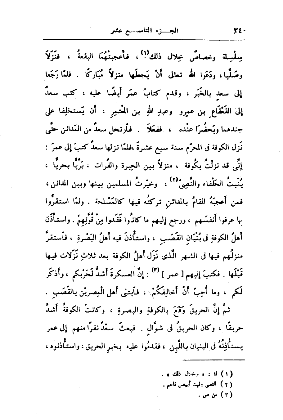 نّى قد نزلت بكوفة، منزلا بين الحيرة والفرات، برّيّا بحريّا، نبت الحلفاء والنّصىّ [2] ، وخيّرت المسلمين بينها وبين المدائن، من أعجبه المقام بالمدائن تركته فيها كالمسلحة. ولمّا استقرّوا عرفوا أنفسهم، ورجع إليهم ما كانوا فقدوا من قوّتهم. واستأذن ل الكوفة فى بنيان القصب، واستأذن فيه أهل البصرة، فاستقرّ لهم فيها فى الشهر الّذى نزل أهل الكوفة بعد ثلاث نزلات فيها ها. فكتب إليهم [عمر] [3] : إنّ العسكرة أشدّ لحربكم، وأذكر، وما أحبّ أن أخالفكم، فابتنى أهل المصرين بالقصب.