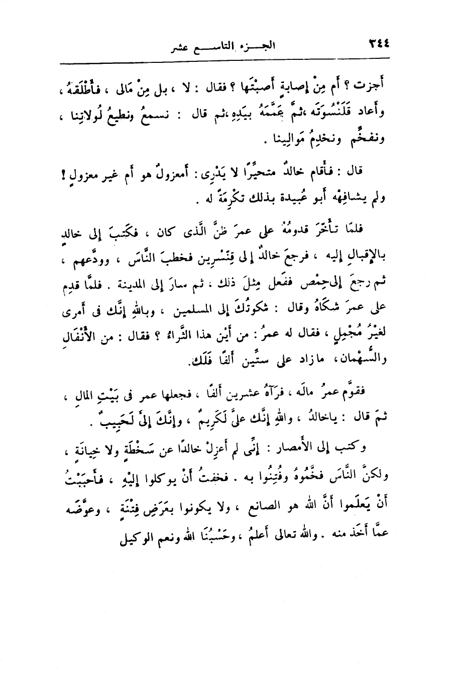 وكتب إلى الأمصار: إنّى لم أعزل خالدا عن سخطة ولا خيانة، ولكنّ النّاس فخّموه وفتنوا به. فخفت أن يوكلوا إليه، فأحببت أن يعلموا أنّ الله هو الصانع، ولا يكونوا بعرض فتنة، وعوّضه عمّا أخذ منه. والله تعالى أعلم، وحسبنا الله ونعم الوكيل