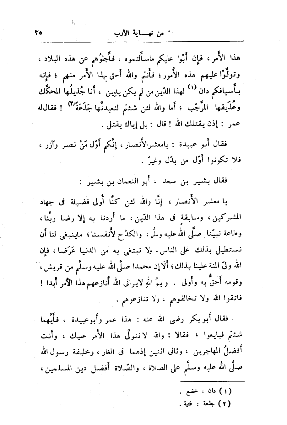 هذا الأمر، فإن أبوا عليكم ما سألتموه، فأجلوهم عن هذه البلاد، وتولّوا عليهم هذه الأمور؛ فأنتم والله أحق بهذا الأمر منهم؛ فإنه بأسيافكم دان [1] لهذا الدّين من لم يكن يدين، أنا جذيلها المحكّك وعذيقها المرّجّب؛ أما والله لئن شئتم لنعيدنّها جذعة [2] ! فقال له عمر: إذن يقتلك الله! قال: بل إياك يقتل.