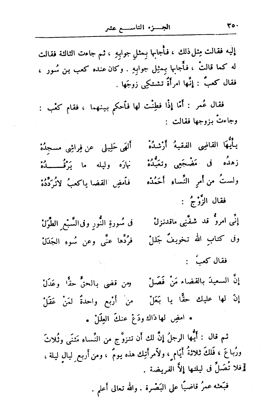 إليه فقالت مثل ذلك، فأجابها بمثل جوابه، ثم جاءت الثالثة فقالت له كما قالت، فأجابها بمثل جوابه. وكان عنده كعب بن سور، فقال كعب: إنّها امرأة تشتكى زوجها.