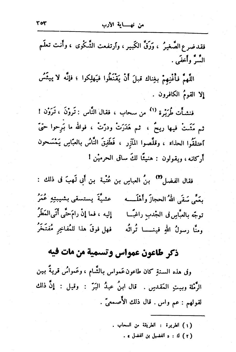فنشأت طريرة [1] من سحاب، فقال النّاس: ترون، ترون! ثم مشت فيها ريح، ثم هدرت ودرّت، فو الله ما برحوا حتّى اعتلقوا الحذاء، وقلّصوا المآزر، فطفق النّاس بالعبّاس يمسحون أركانه، ويقولون: هنيئا لك ساقى الحرمين! فقال الفضل [2] بن العباس بن عتبة بن أبى لهب فى ذلك: