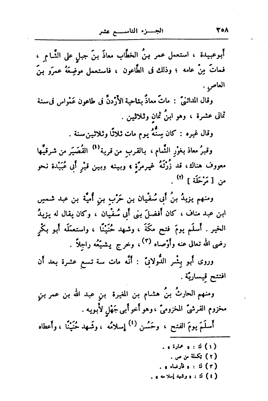 وقال المدائنىّ: مات معاذ بناحية الأردنّ فى طاعون عمواس فى سنة ثمانى عشرة، وهو ابن ثمان وثلاثين.