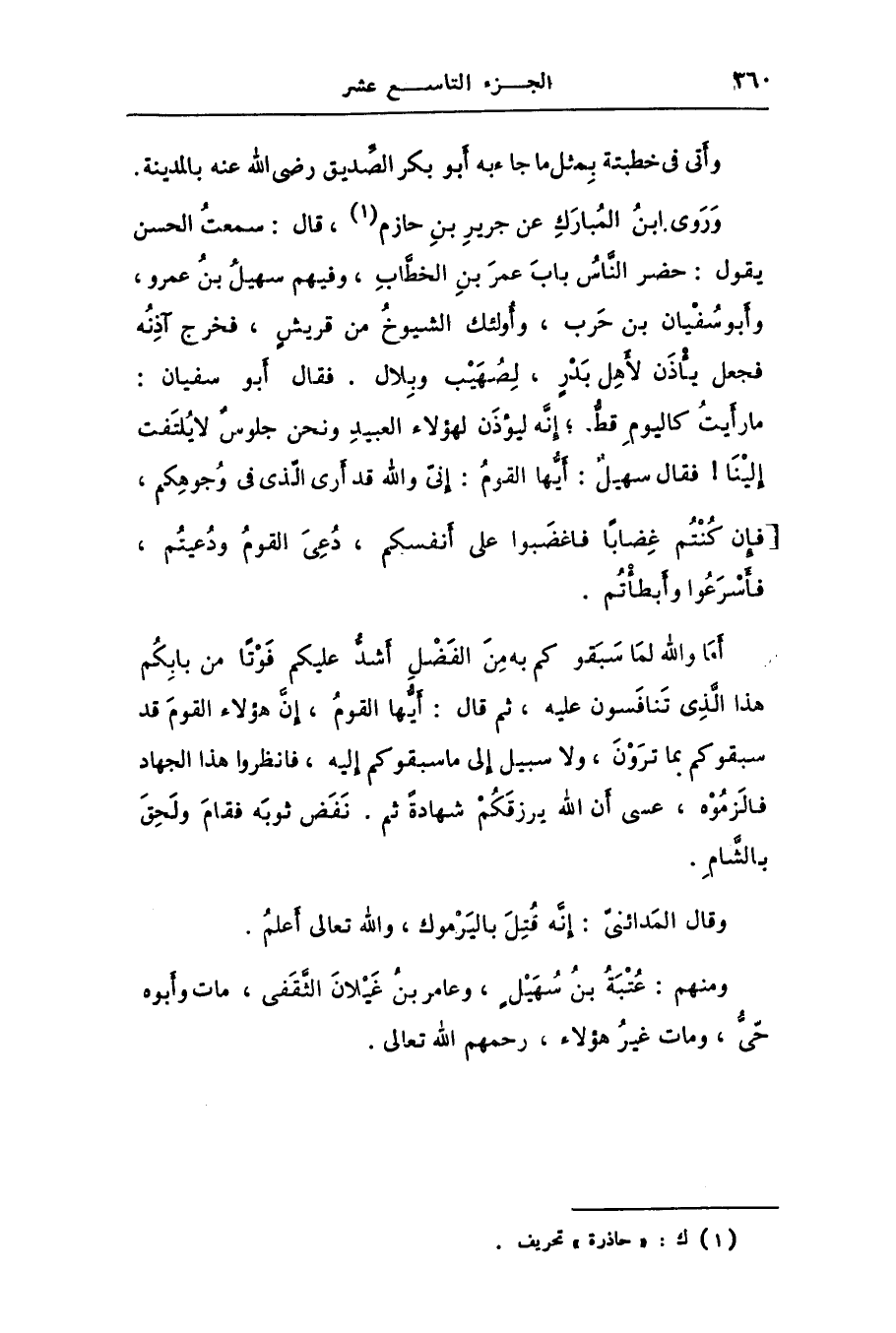 وروى ابن المبارك عن جرير بن حازم [1] ، قال: سمعت الحسن يقول: حضر النّاس باب عمر بن الخطّاب، وفيهم سهيل بن عمرو، وأبو سفيان بن حرب، وأولئك الشيوخ من قريش، فخرج آذنه فجعل يأذن لأهل بدر، لصهيب وبلال. فقال أبو سفيان: