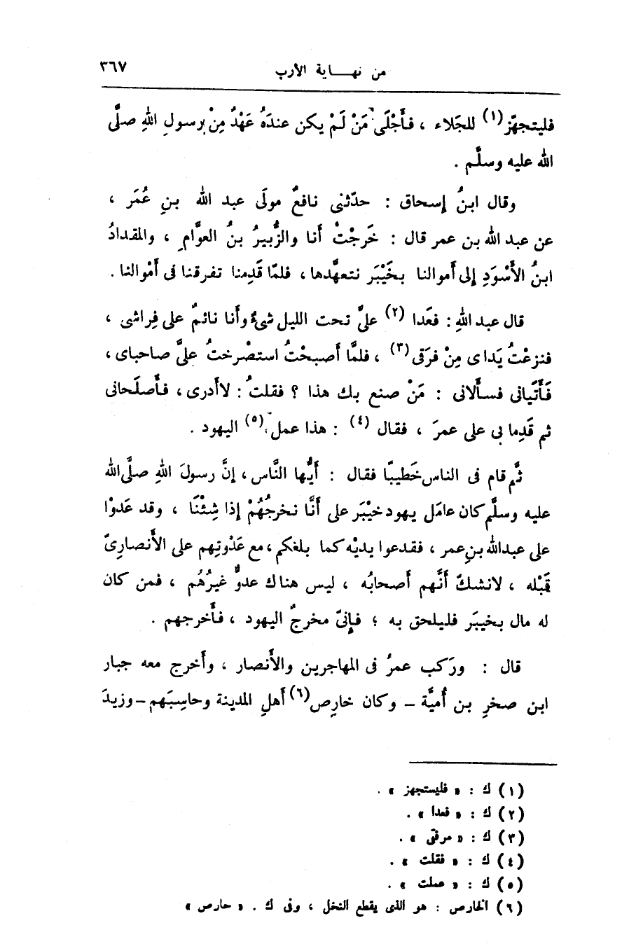 ثمّ قام فى الناس خطيبا فقال: أيّها النّاس، إنّ رسول الله صلّى الله عليه وسلّم كان عامل يهود خيبر على أنّا نخرجهم إذا شئنا، وقد عدوا على عبد الله بن عمر، فقدعوا يديه كما بلغكم، مع عدوتهم على الأنصارىّ قبله، لا نشكّ أنّهم أصحابه، ليس هناك عدوّ غيرهم، فمن كان له مال بخيبر فليلحق به؛ فإنّى مخرج اليهود، فأخرجهم.