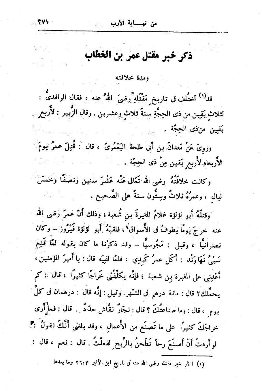 وقتله أبو لؤلؤة غلام المغيرة بن شعبة؛ وذلك أنّ عمر رضى الله عنه خرج يوما يطوف فى الأسواق، فلقيه أبو لؤلؤة فيروز- وكان نصرانيّا، وقيل: مجوسيّا- وقد ذكرنا ما كان يقوله لمّا قدم سبى نهاوند: أكل عمر كبدى، فلمّا لقيه قال: يا أمير المؤمنين، أعدنى على المغيرة بن شعبة؛ فإنّه يكلّفنى خراجا كثيرا، قال: كم يحمّلك؟ قال: مائة درهم فى الشّهر. وقيل: إنّه قال: درهمان فى كلّ يوم، قال: وما صناعتك؟ قال: نجّار نقّاش حدّاد. قال: فما أرى خراجك كثيرا على ما تصنع من الأعمال، وقد بلغنى أنّك تقول: