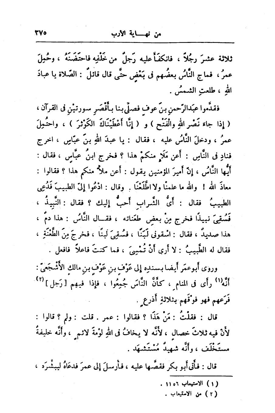 فقدّموا عبد الرّحمن بن عوف فصلّى بنا بأقصر سورتين فى القرآن، (إذا جاء نصر الله والفتح) و (إنّا أعطيناك الكوثر) ، واحتمل عمر، ودخل النّاس عليه، فقال: يا عبد الله بن عبّاس، اخرج فناد فى النّاس: أعن ملإ منكم هذا؟ فخرج ابن عبّاس، فقال: