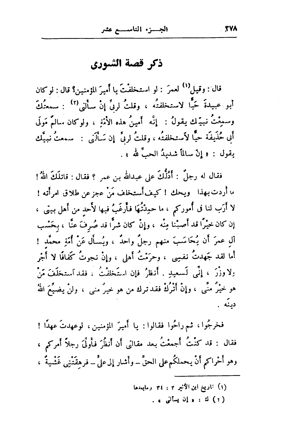 فقال له رجل: أدلّك على عبد الله بن عمر؟ فقال: قاتلك الله! ما أردت بهذا ويحك! كيف أستخلف من عجز عن طلاق امرأته! لا أرب لنا فى أموركم، ما حمدتها فأرغب فيها لأحد من أهل بيتى، إن كان خيرا قد أصبنا منه، وإن كان شرّا قد صرف عنّا، بحسب آل عمر أن يحاسب منهم رجل واحد، ويسأل عن أمّة محمّد! أما لقد جهدت نفسى، وحرمت أهلى، وإن نجوت كفافا لا أجر ولا وزر، إنّى لسعيد. أنظر فإن استخلفت، فقد استخلف من هو خير منّى، وإن أترك فقد ترك من هو خير منى، ولن يضيّع الله دينه.