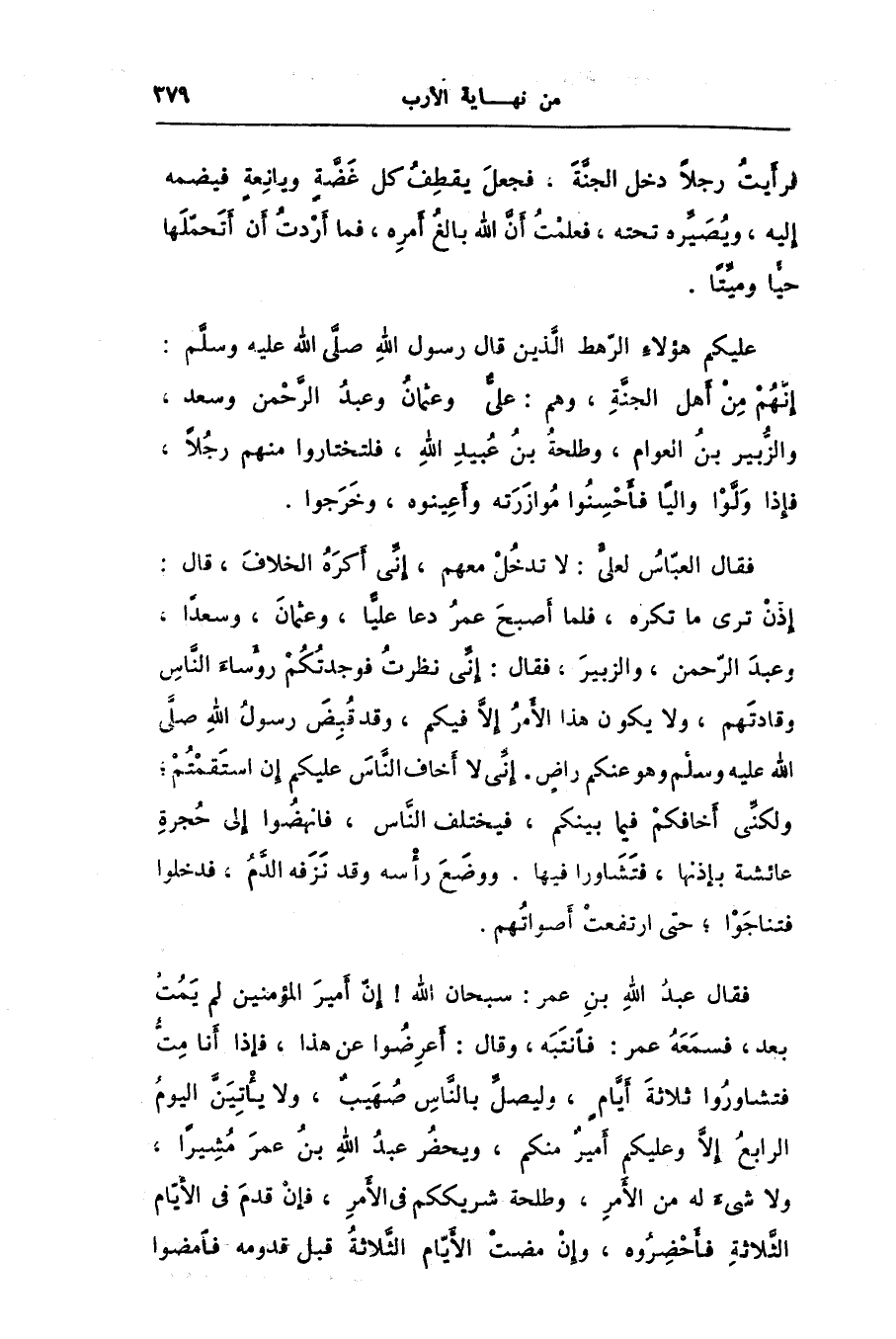 إنّهم من أهل الجنّة، وهم: علىّ وعثمان وعبد الرّحمن وسعد، والزّبير بن العوام، وطلحة بن عبيد الله، فلتختاروا منهم رجلا، فإذا ولّوا واليا فأحسنوا موازرته وأعينوه، وخرجوا.