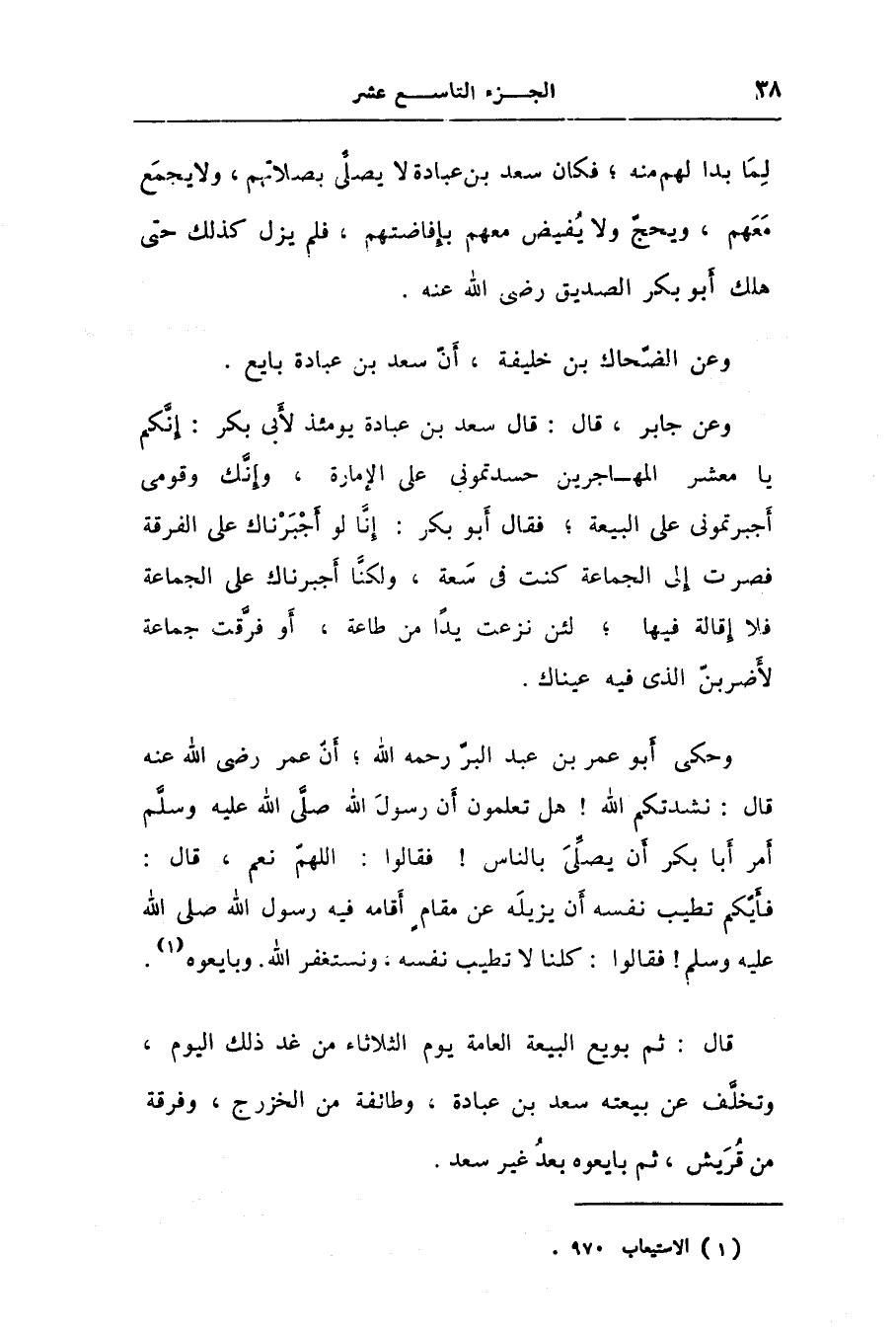 وعن جابر، قال: قال سعد بن عبادة يومئذ لأبى بكر: إنّكم يا معشر المهاجرين حسدتمونى على الإمارة، وإنّك وقومى أجبرتمونى على البيعة؛ فقال أبو بكر: إنّا لو أجبرناك على الفرقة فصرت إلى الجماعة كنت فى سعة، ولكنّا أجبرناك على الجماعة فلا إقالة فيها؛ لئن نزعت يدا من طاعة، أو فرّقت جماعة لأضربنّ الذى فيه عيناك.