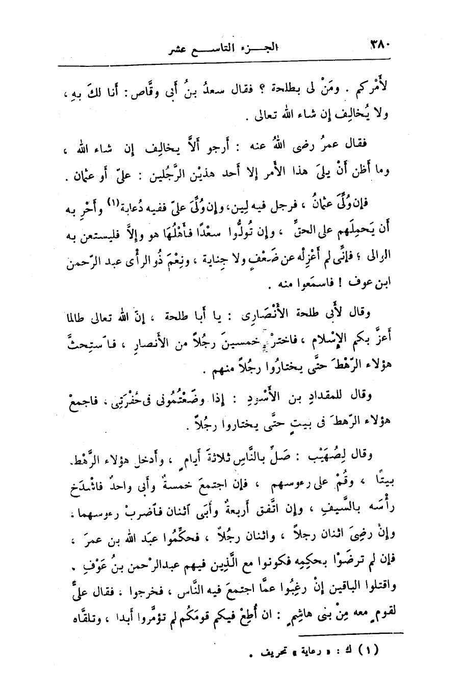 لأمركم. ومن لى بطلحة؟ فقال سعد بن أبى وقّاص: أنا لك به، ولا يخالف إن شاء الله تعالى.