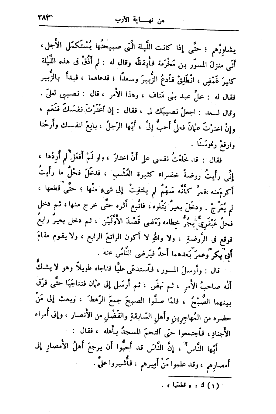 فقال: قد خلعت نفسى على أن اختار، ولو لم أفعل لم أردها، إنّى رأيت روضة خضراء كثيرة العشب، فدخل فحل ما رأيت أكرم منه، فمرّ كأنّه سهم لم يلتفت إلى شىء منها؛ حتّى قطعها، لم يعرّج. ودخل بعير يتلوه، فاتّبع أثره حتّى خرج منها، ثم دخل فحل عبقرىّ يجرّ خطامه ومضى قصد الأوّلين، ثم دخل بعير رابع فوقع فى الرّوضة، ولا والله لا أكون الراتع الرابع، ولا يقوم مقام أبى بكر وعمر بعدهما أحد فيرضى النّاس عنه.