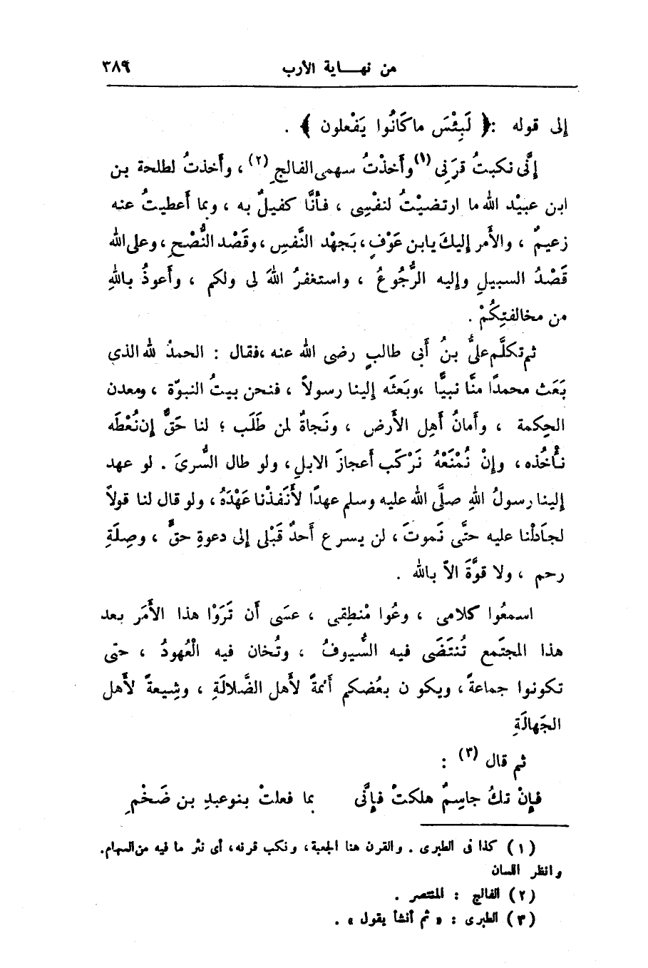 اسمعوا كلامى، وعوا منطقى، عسى أن تروا هذا الأمر بعد هذا المجتمع تنتضى فيه السّيوف، وتخان فيه العهود، حتى تكونوا جماعة، ويكون بعضكم أئمة لأهل الضّلالة، وشيعة لأهل الجهالة ثم قال [3] :