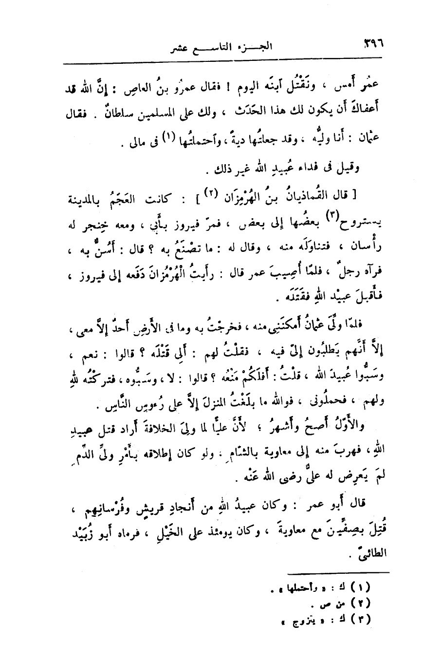عمر أمس، ونقتل ابنه اليوم! فقال عمرو بن العاص: إنّ الله قد أعفاك أن يكون لك هذا الحدث، ولك على المسلمين سلطان. فقال عثمان: أنا وليّه، وقد جعلتها دية، واحتملتها [1] فى مالى.