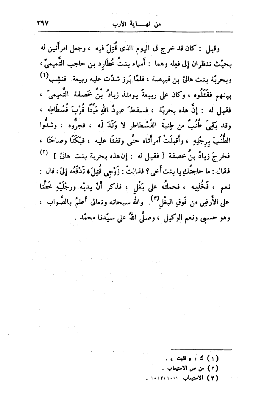وقيل: كان قد خرج فى اليوم الذى قتل فيه، وجعل امرأتين له بحيث تنظران إلى فعله وهما: أسماء بنت عطارد بن حاجب التّميمىّ، وبحريّة بنت هانئ بن قبيصة، فلمّا برز شدّت عليه ربيعة فنشب [1] بينهم فقتلوه، وكان على ربيعة يومئذ زياد بن خصفة التّميمىّ، فقيل له: إنّ هذه بحريّة، فسقط عبيد الله ميّتا قرب فسطاطه، وقد بقى طنب من طنبة الفسطاط لا وتد له، فجرّوه، وشدّوا الطّنب برجله، وأقبلت امرأتاه حتّى وقفتا عليه، فبكتا وصاحتا، فخرج زياد بن خصفة [فقيل له: إن هذه بحرية بنت هانئ] [2] فقال: ما حاجتك يا بنت أخى؟ فقالت: زوجى قتل، تدفعه إلىّ، قال: