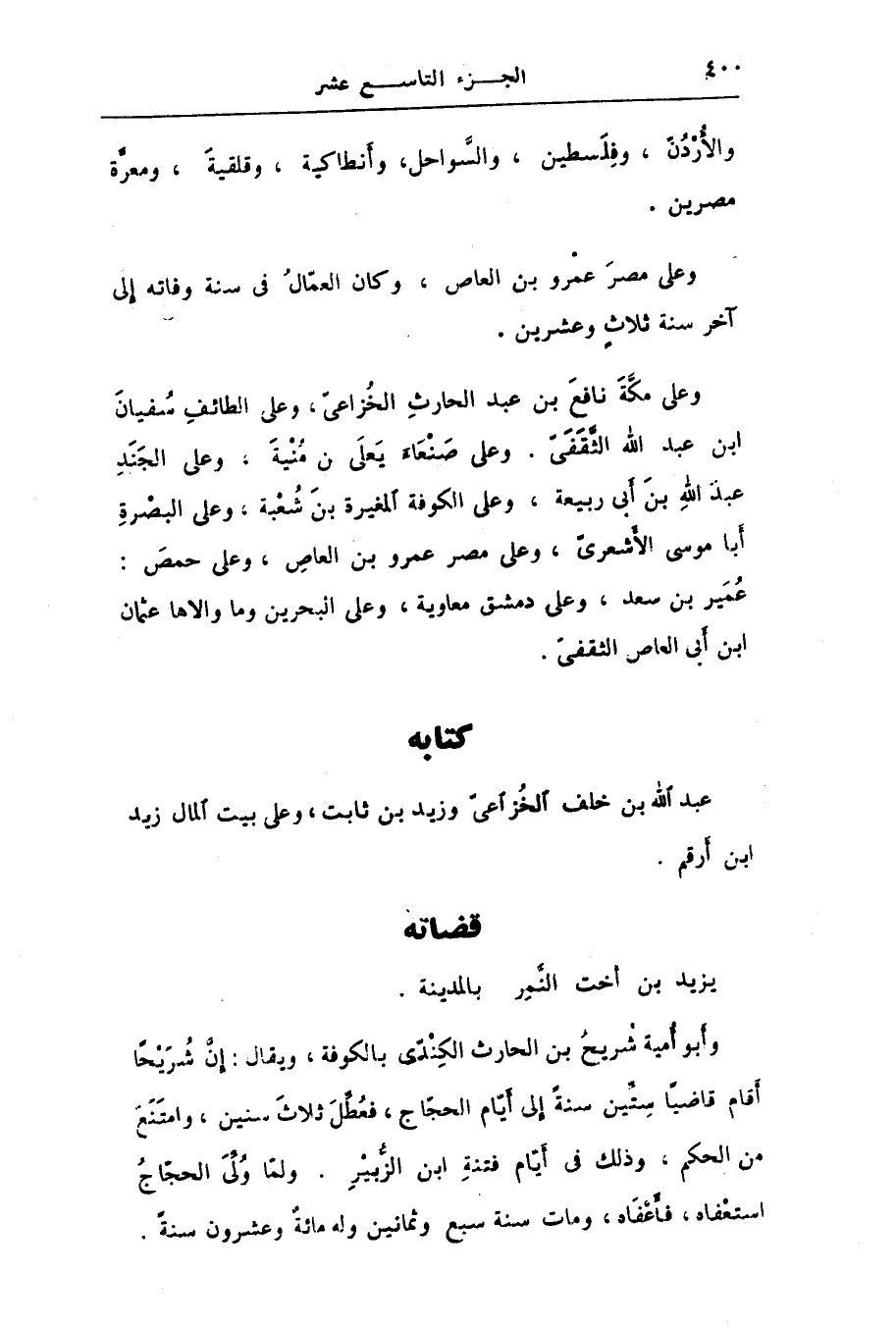 عبد الله بن خلف الخزاعىّ وزيد بن ثابت، وعلى بيت المال زيد ابن أرقم.