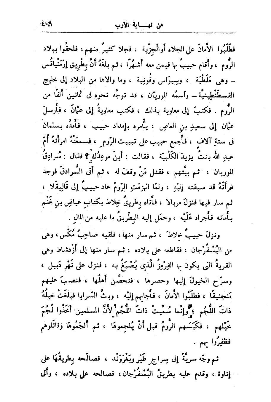 فطلبوا الأمان على الجلاء أو الجزية، فجلا كثير منهم، فلحقوا ببلاد الرّوم، وأقام حبيب بها فيمن معه أشهرا، ثم بلغه أنّ بطريق إرمنياقس- وهى ملطية، وسيواس وقونية، وما والاها من البلاد إلى خليج القسطنطينيّة- واسمه الموريّان، قد توجّه نحوه فى ثمانين ألفا من الرّوم. فكتب إلى معاوية بذلك، فكتب معاوية إلى عثمان، فأرسل عثمان إلى سعيد بن العاص، يأمره بإمداد حبيب، فأمدّه بسلمان فى ستة آلاف، فأجمع حبيب على تبييت الرّوم، فسمعته امرأته أمّ عبد الله بنت يزيد الكلبيّة، فقالت: أين موعدك؟ فقال: سرادق الموريان، ثم بيّتهم، فقتل من وقف له، ثم أتى السّرادق فوجد امرأته قد سبقته إليه، ولمّا انهزمت الرّوم عاد حبيب إلى قاليقلا، ثم سار فيها فنزل مربالا، فأتاه بطريق خلاط بكتاب عياض بن غنم بأمانه فأجراه عليه، وحمل إليه البطريق ما عليه من المال.