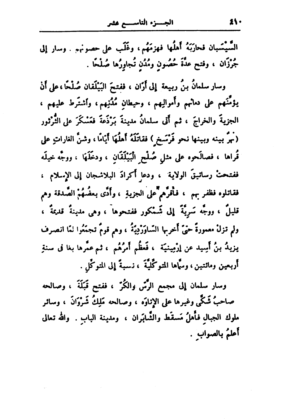 وسار سلمان إلى مجمع الرّسّ والكرّ، ففتح قبلة، وصالحه صاحب شكّى وغيرها على الإتاوه، وصالحه ملك شروان، وسائر ملوك الجبال فأهل مسقط والشّابران، ومدينة الباب. والله تعالى أعلم بالصواب.